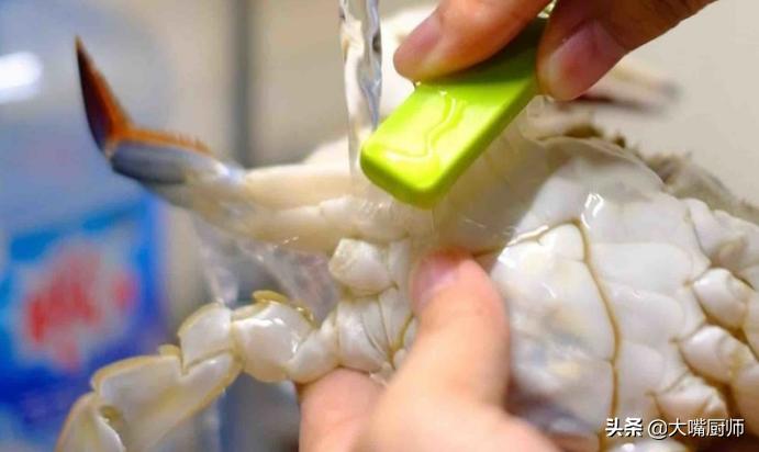 不管是大闸蟹还是梭子蟹,表面看着很干净,其实还是有很多脏东西的,所以不能只用清水冲,还需要用刷子仔细刷洗,然后用食用碱水浸泡5分钟。食用碱有很强的去污去异味的能力,能除掉蟹壳上的杂质,并去除异味,螃蟹吃起来更香。