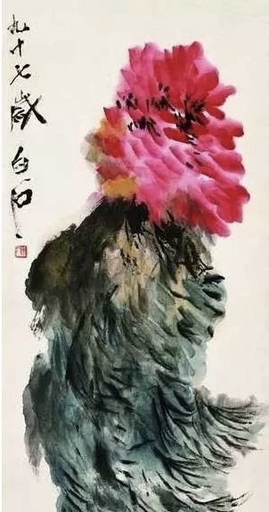 "“红花墨叶”":这是齐白石花卉画最显著的标志。画中的牡丹花用浓墨勾勒轮廓,然后填上非常鲜艳、饱和度极高的朱砂红或胭脂红,形成强烈的色彩对比。这种用色大胆而鲜明,极具装饰性和视觉冲击力。