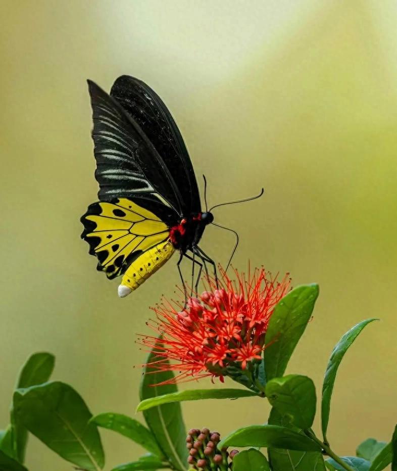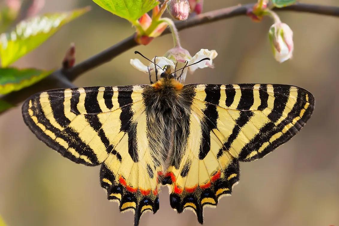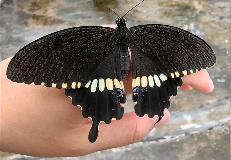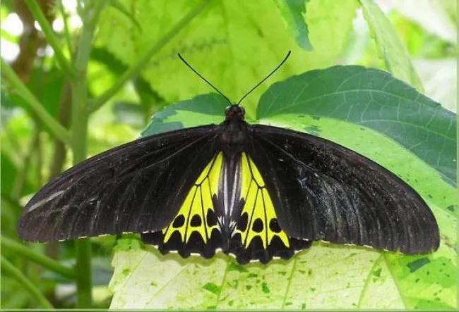 与金裳凤蝶区别:观察翅膀花纹是区分这两种蝴蝶的关键。注意后翅上空间2和3中的边缘点,如果这些点不被黑色暗纹覆盖,那就是金裳凤蝶;如果黄黑颜色分明,那就是普通裳凤蝶。