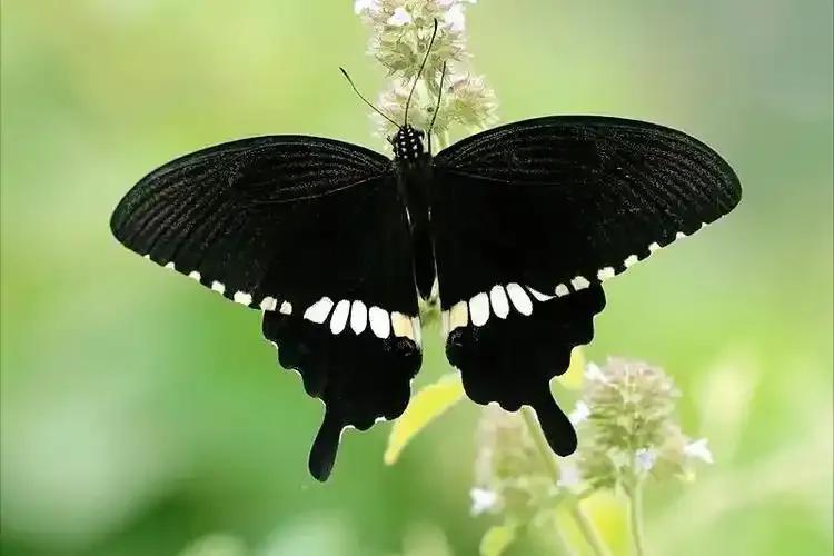 玉带凤蝶在亚洲多地广泛分布,为中型蝴蝶, 翅展77 - 95毫米。翅膀主体呈黑色,前翅外缘有一列向顶角逐渐变大的小白斑;后翅中部有一条白色的宽带,宽度较为均匀,就像一条玉带环绕在翅膀上,这也是“玉带凤蝶”名称的由来。