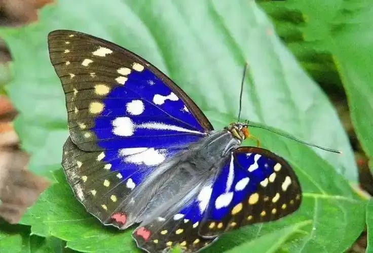 大紫蛱蝶是大型蝴蝶,翅展约86 - 110毫米。中国国家二级保护动物。翅紫黑色,有白色斑点点缀其中,后翅臀角附近有红色斑,在阳光照射下能闪烁出紫色的金属光泽,十分华丽。 雌蝶翅面颜色较淡,紫色光泽不明显,斑纹与雄蝶相似,但更为宽大。胸部和腹部被有浓密的绒毛,颜色多为深褐色或黑色。