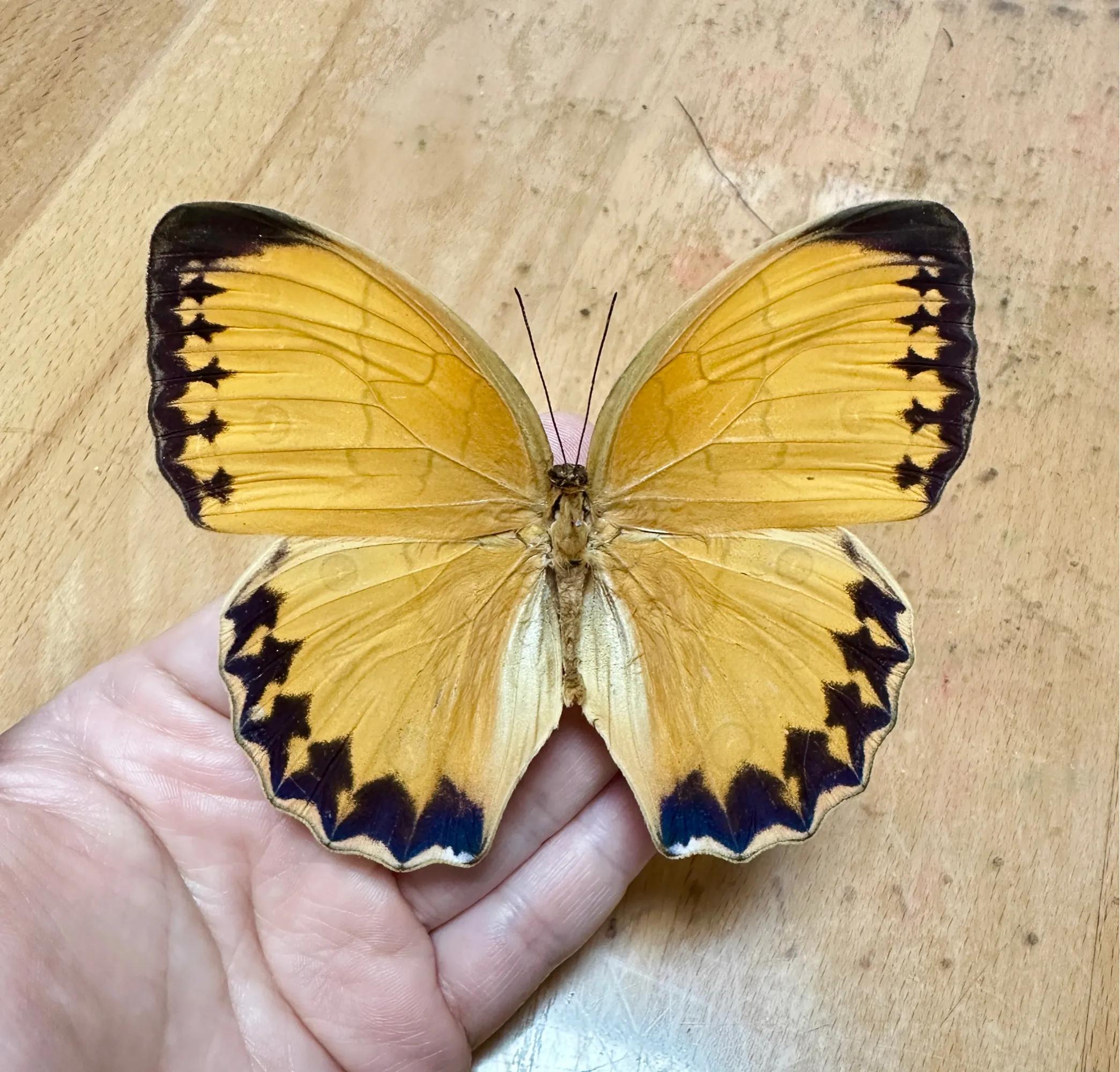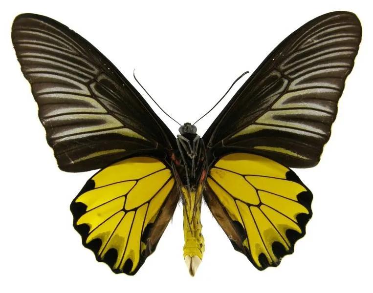 金裳凤蝶是大型蝴蝶,其翅展100 - 150毫米左右,为国家二级重点保护野生动物。雄蝶底色为黑色,有光泽。翅脉清晰,脉纹两侧颜色略深,使得翅面的黑色呈现出一定的层次感。后翅金黄色区域占据较大面积,与黑色部分相互映衬,界限分明。雌蝶整体与雄蝶相似,但雌蝶体型通常更大。 颜色相对雄蝶略淡,具有极高的辨识度。