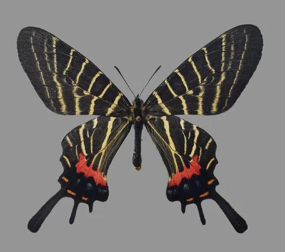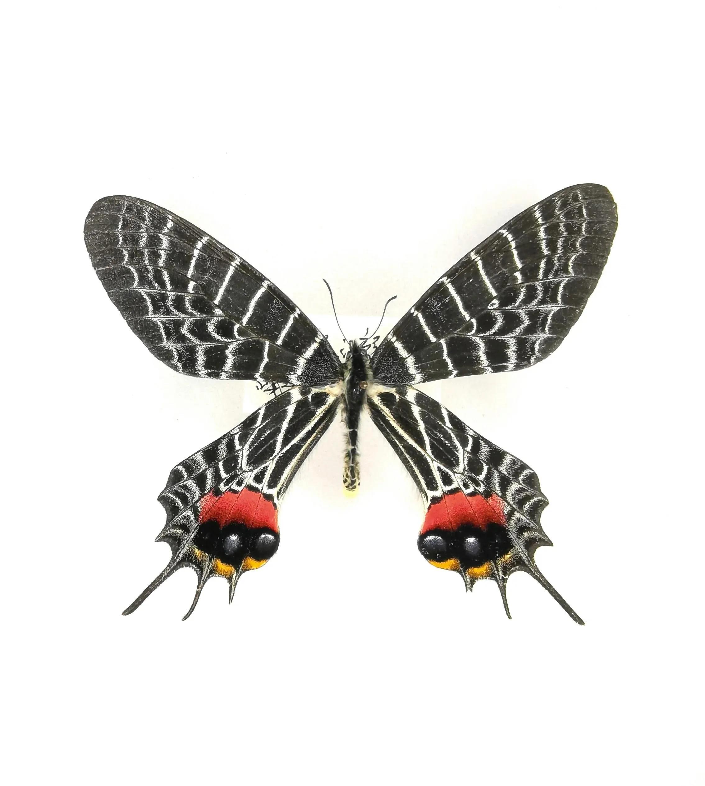 多尾凤蝶是凤蝶科尾凤蝶属的昆虫,是一种大型蝴蝶,翅展可达90-120毫米。体翅呈黑色,前翅有8条白色或浅黄色的横带,这些横带贯穿整个翅膀,其中有几条延伸至后缘。后翅形态独特,具有多个细长的尾突,通常有4-5条,这也是它被称为“多尾”凤蝶的原因。后翅上还布满了红色和黄色的斑纹,色彩鲜艳夺目。