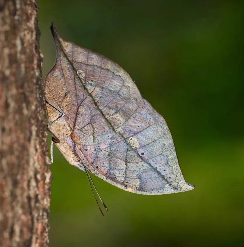 反面侧,枯叶蛱蝶将翅膀合拢后,就会露出翅膀的反面,外观如同一片枯萎的叶子。翅膀反面的颜色和纹理模仿枯叶极为逼真,有类似叶脉的纹路,还有类似叶子叶柄、甚至霉斑的图案,就像被虫蛀过的枯叶。