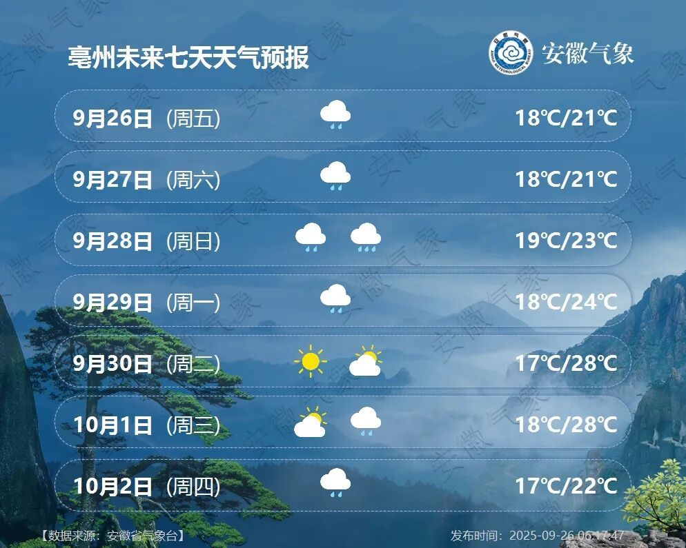 10月1-2日(周三至周四):淮北地区和江淮之间北部阴天有小到中雨,部分地区大雨,局部暴雨;江淮之间南部和江南多云,部分地区有雷阵雨。