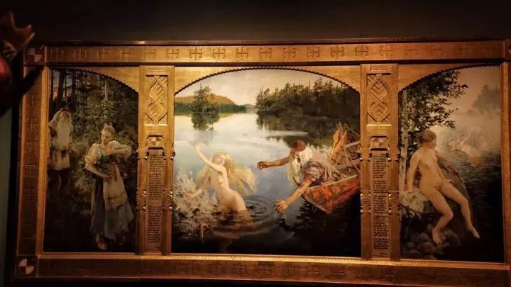 其中,最著名的当属加伦-卡莱拉(Akseli Gallen-Kallela, 1865-1931)为芬兰史诗《卡莱瓦拉》(Kalevala)绘制的三联画。另外还有一些同时代的外国艺术品。