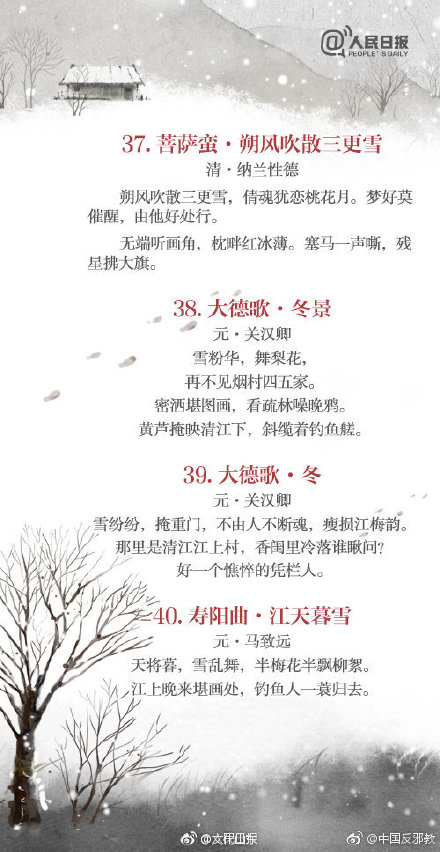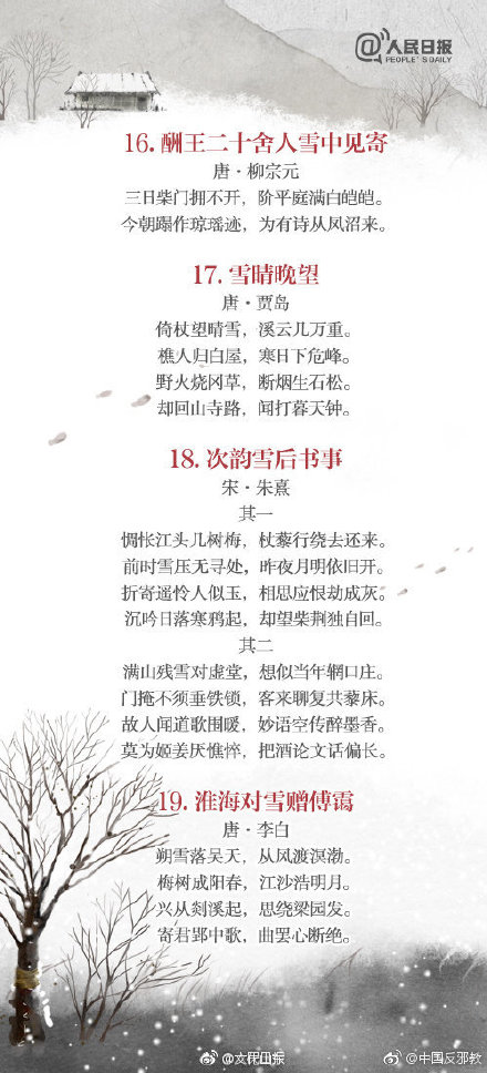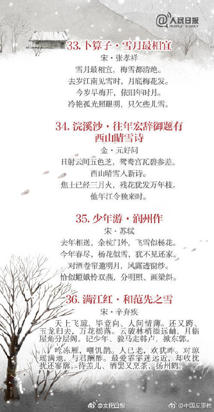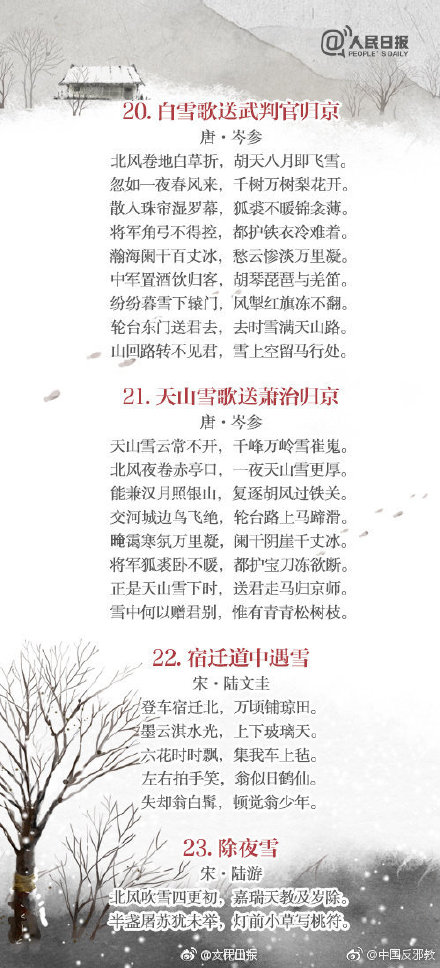 文化方舟 【40首古诗词,带你赏诗意雪景】近日,北方多地出现降雪,雪花纷飞,银装素裹,引得无数文人墨客为它写下动人诗篇。“白雪却嫌春色晚,故穿庭树作飞花”、“忽如一夜春风来,千树万树梨花开”、“千里黄云白日曛,北风吹雁雪纷纷”……40首关于雪的古诗词品读,收藏! via:人民日报