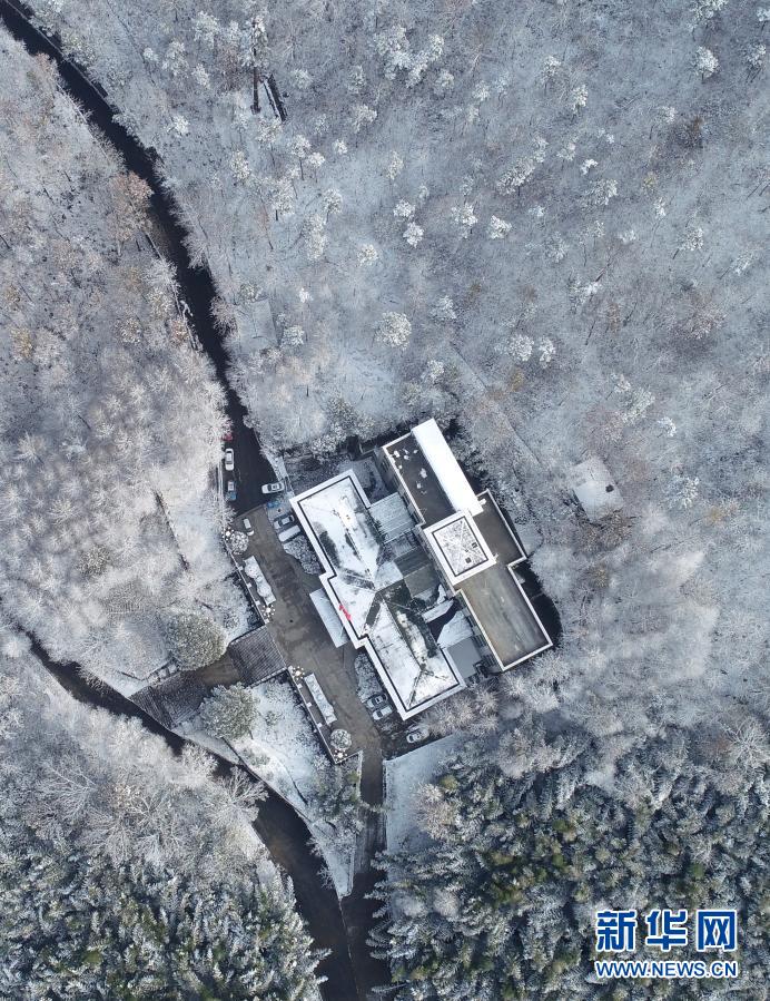 12月14日在安徽省巢湖市东庵森林公园内拍摄的雪景(无人机照片)。