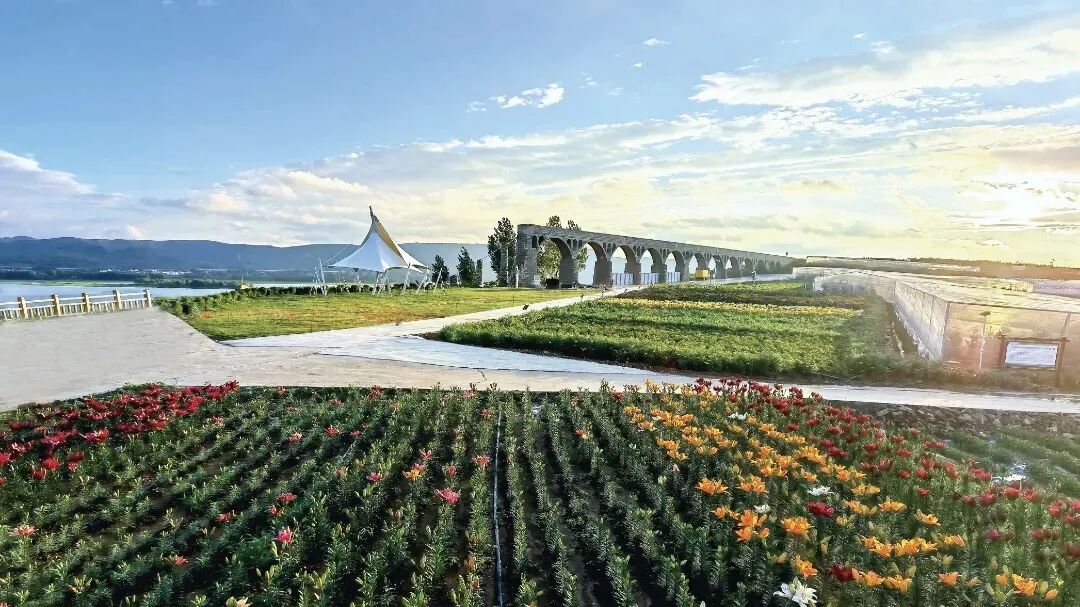下一站是雪茄种植品尝基地,这里的风光堪称“一步一惊喜”。基地之上是一片碧绿的草坪,宛如“空中草原”;一侧紧挨着无边无际的跋山水库,另一侧则是连绵起伏的青山,山水相依,视野开阔。更有一座古老的渡槽静静矗立,新旧景致交融,别有一番古朴与灵动并存的韵味。