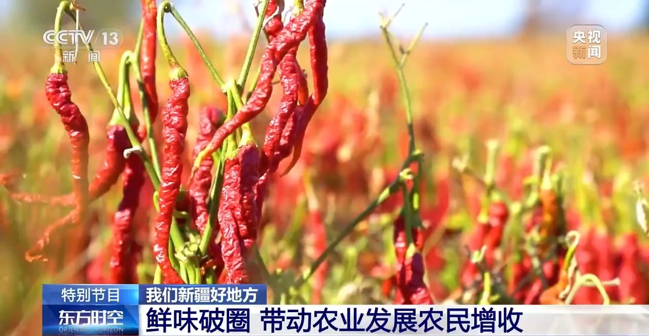 说完了主角,再来说说配菜。这里面的土豆来自博尔通古乡。最关键的辣椒,是当地的主要农作物,来自“辣椒之乡”安集海镇。过去这里的辣椒只是农民零散种植,如今已经形成了从育种、种植、加工到销售的完整产业链。这些辣椒不仅给大盘鸡“注入灵魂”,也满足了全国的餐桌需求,还出口到韩国、日本等地。