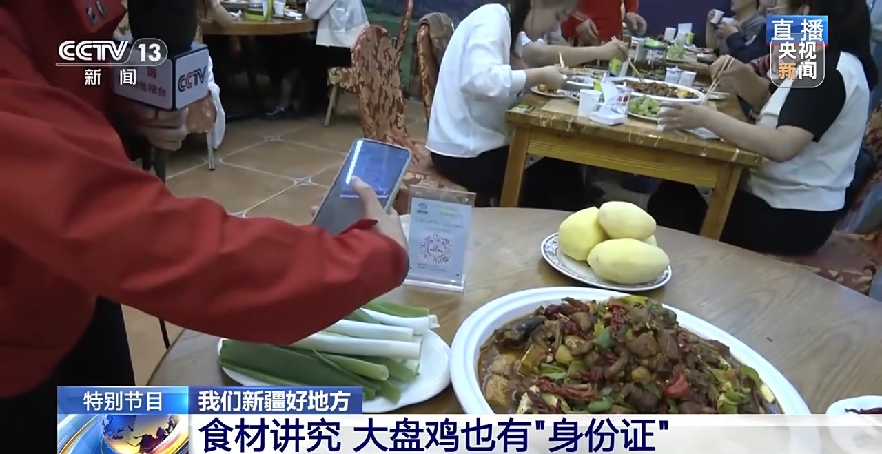 其实,大盘鸡里的每一种原料,都是新疆农业发展的缩影。先说这最主要的鸡肉,是来自当地标准化散养的土鸡,这可不是一般的鸡,它让大盘鸡有了“电子身份证”,我们来扫码看看。
