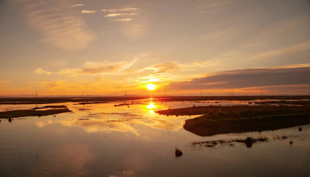 日出东方,远看达里诺尔湖,阳光和云彩倒映在湖面上。摄影:朱国良