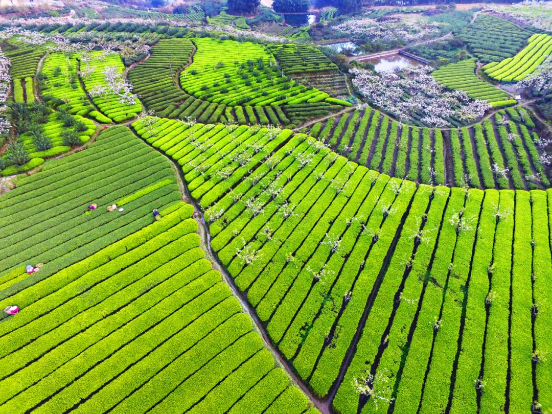 在重庆市璧山区的茶叶种植基地,翠绿茶田如波浪般铺展,茶树整齐排列。 摄影: 张洁