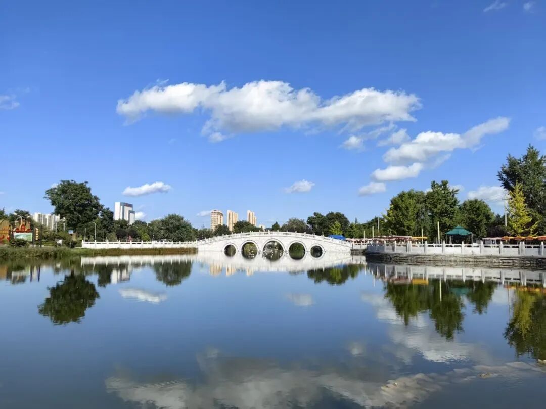 金秋时节,庆阳南湖湿地公园碧波荡漾,湖水与建筑、绿地交相辉映,构成一幅美丽的城市生态画卷。摄影:刘翔