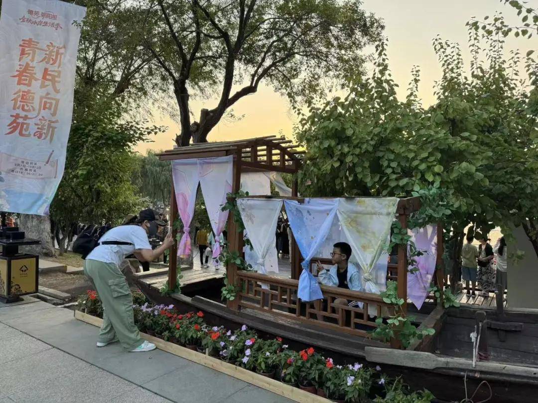 “丹凤朝阳・竹筏巡游”成为园区内最受欢迎的“流动风景线”湖面上一艘装饰精美的大竹筏牵引着四艘小竹筏沿湖缓缓游弋宛如江南水乡画卷