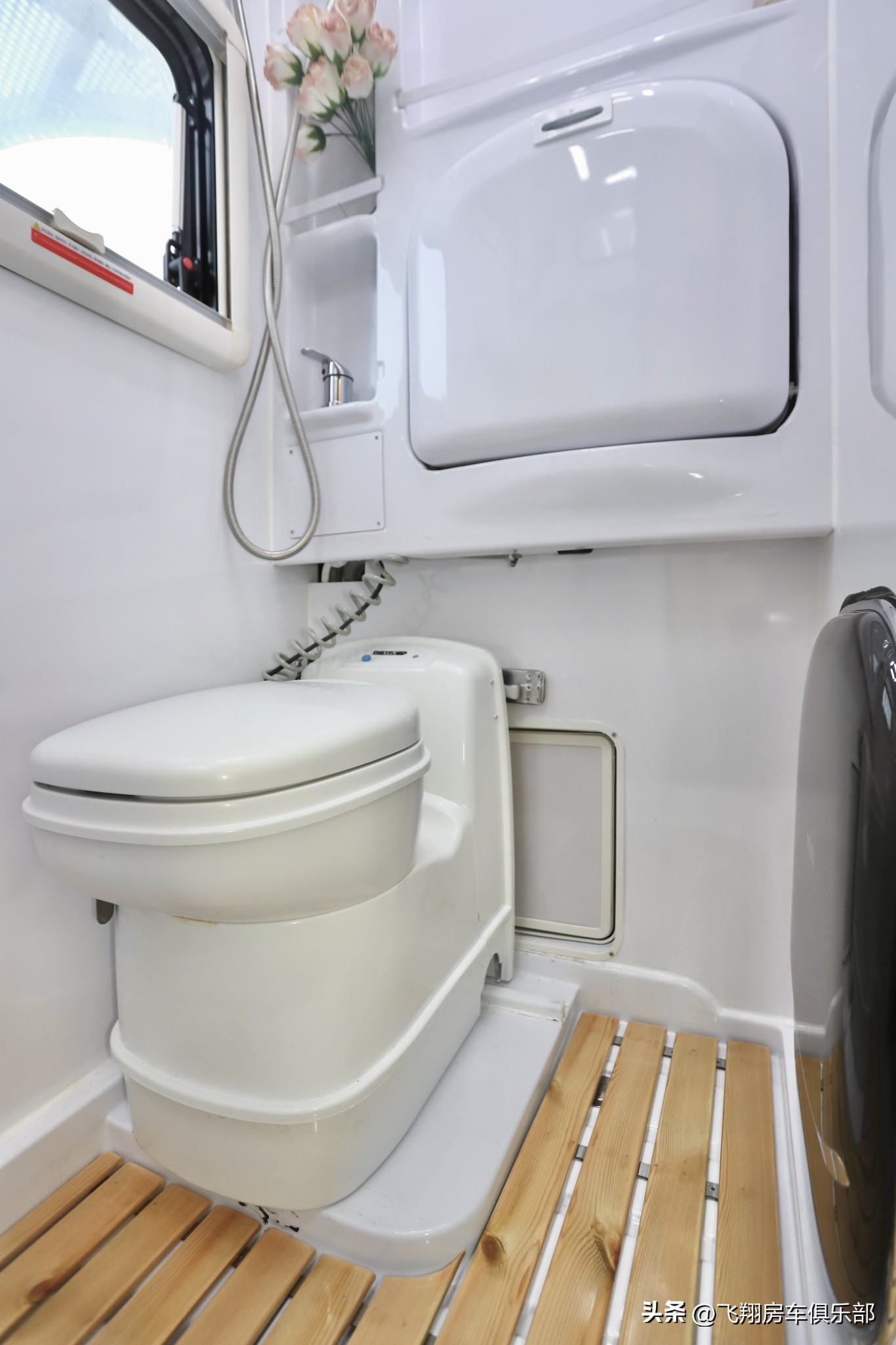 在车身的尾部就是卫生间区域啦,采用弧形的设计,对空间利用更合理,打开门之后,里面有双向换气扇、淋浴花洒、毛巾架、五孔插座、外推窗、还是折叠洗手盆,不仅尺寸够大,满足洗脸洗手洗衣服的要求,平时不用还能收起来不占用空间,最下面就是赛特福德抽拉马桶,还自带一个侧滑功能哦~