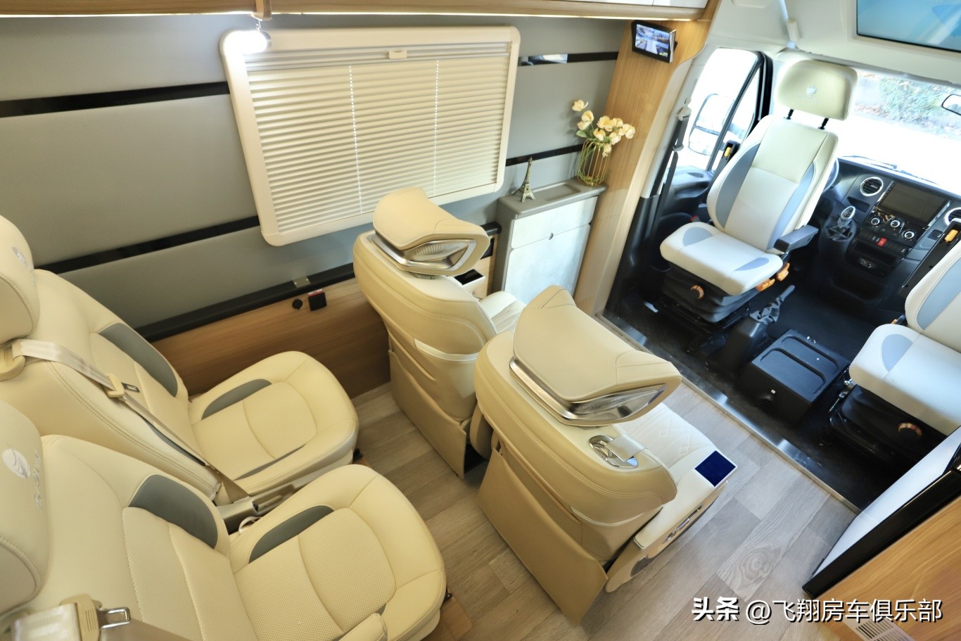 本车是核载6人的状态,除了会客厅的四个座椅之外,还有两个座位就隐藏在了固定床的下方,这就让核载人数和空间的问题达到了巧妙的平衡,当出行人数较多的时候,这两个座位就派上用场了。