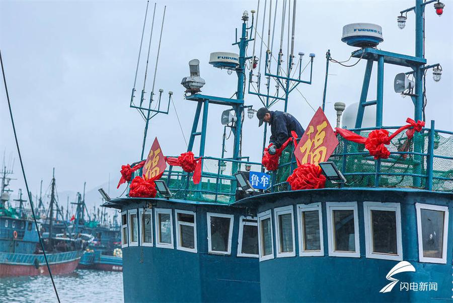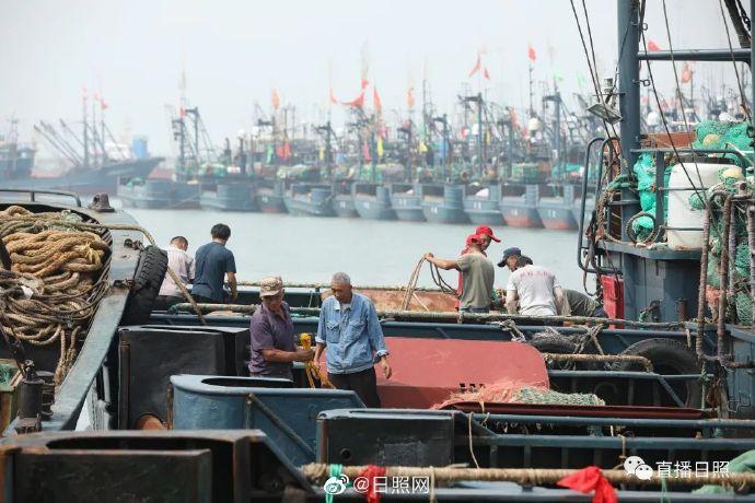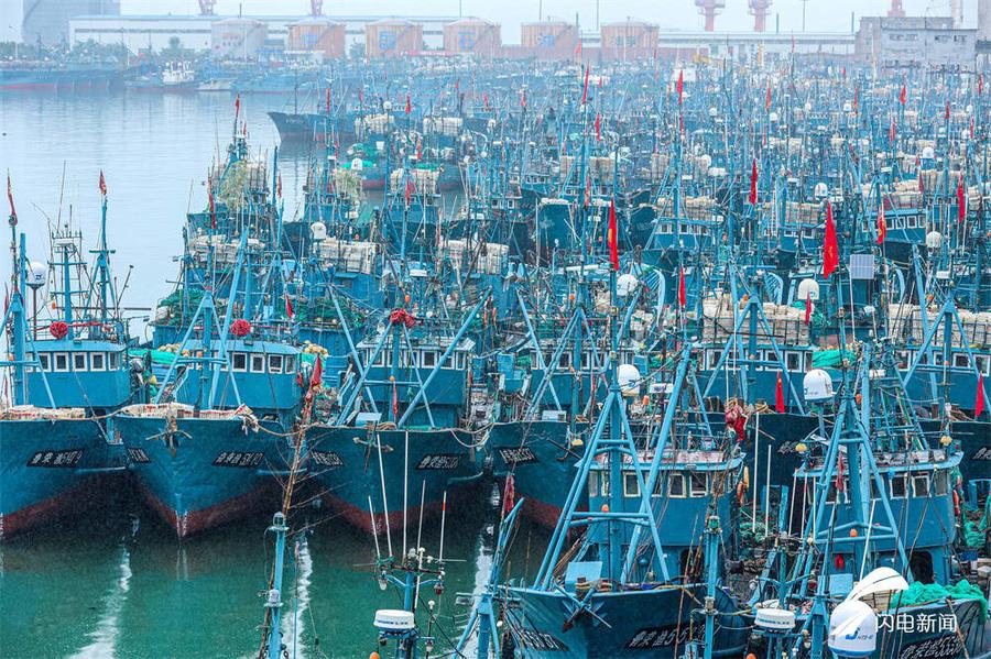 2022年8月30日,在山东省青岛市城阳区河套街道渔港,修整好的渔船蓄势待发,渔民开始往船上运送渔网和生活用品。