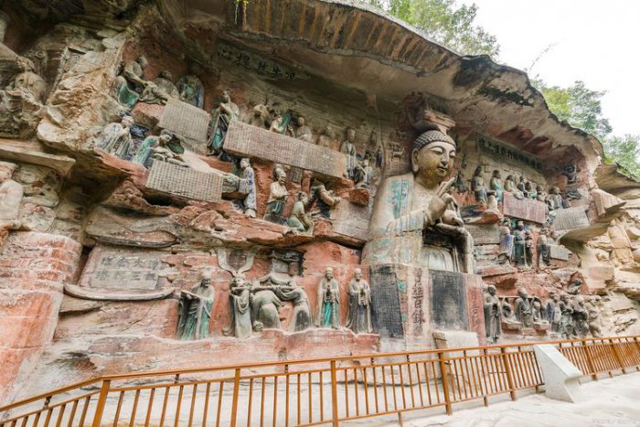 大足石刻在大足区,是区内141处摩崖造像的总称,开凿于初唐永徽年间,历经多朝多代。其规模宏大、雕刻精美、题材多样,是中国晚期石窟艺术代表作之一,与云岗石窟、龙门石窟和莫高窟相齐名。