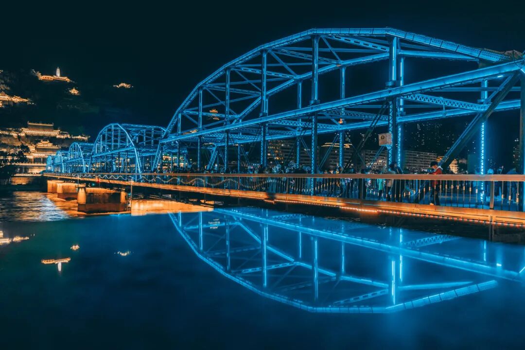 中山桥,西北地区首座引进外国技术建筑的桥梁,是黄河上修建最早和唯一保存至今的近现代钢架梁桥,集使用、历史和文物价值于一身,夜晚彩灯闪耀,周边夜景十分漂亮。