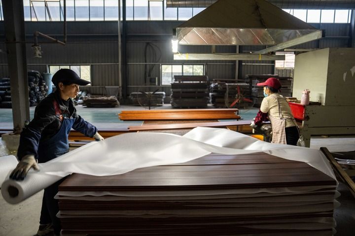 2024年12月10日,在位于永州市双牌县竹木产业智能科技园的湖南省有竹科技有限公司,工人在生产竹木地板。新华每日电讯记者陈思汗摄