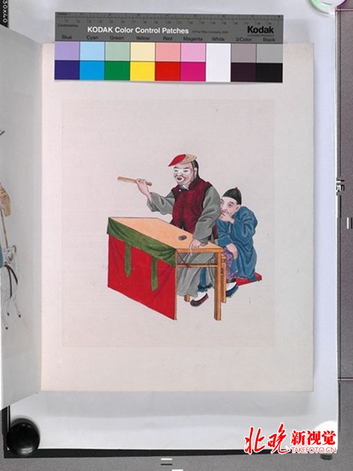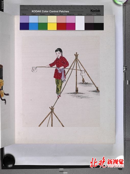 18世纪的老北京有哪些行当?展览中,一件有趣的展品——《老北京三百六十行画册》可以给你答案。这件首博收藏的画册绘制了从1644年至1911年间的五花八门的行业。一册编入50图,全十册共收纳行业500种。描绘了农夫、渔夫、地摊商贩、游商、工匠、扫街的、卖艺的等等。人物描绘形象生动,场景真实、着色鲜艳。