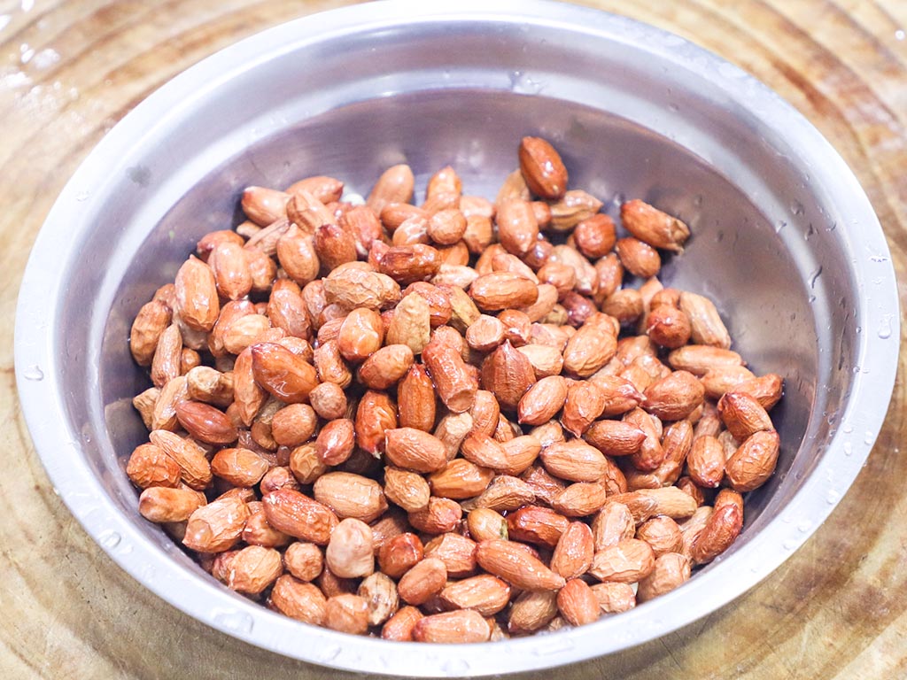 花生米500克倒入适量的清水,水量要没过花生米浸泡5分钟;5分钟之后把花生搓洗干净,捞出控干水分备用。