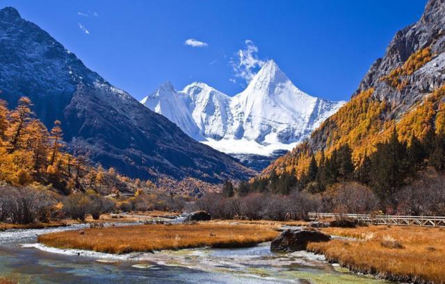 9. 四川稻城亚丁:稻城三神山的秋色被誉为“蓝色星球最后一片净土”,雪山、彩林、冰川湖在金黄草甸映衬下宛如油画,是众多摄影爱好者和旅行者的向往之地。