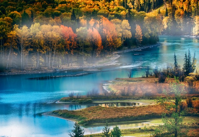 15、喀纳斯湖(新疆维吾尔自治区):中国最深的冰碛堰塞湖,湖光山色美不胜收,以"湖怪"传说和秋季彩林闻名。