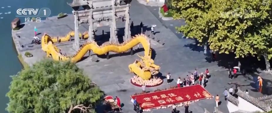 在安徽黟县西递古村落,村民们用玉米打造出巨型“玉米龙”。色彩斑斓的农作物,晾晒在房前屋后的空地上,与粉墙黛瓦相映成趣。