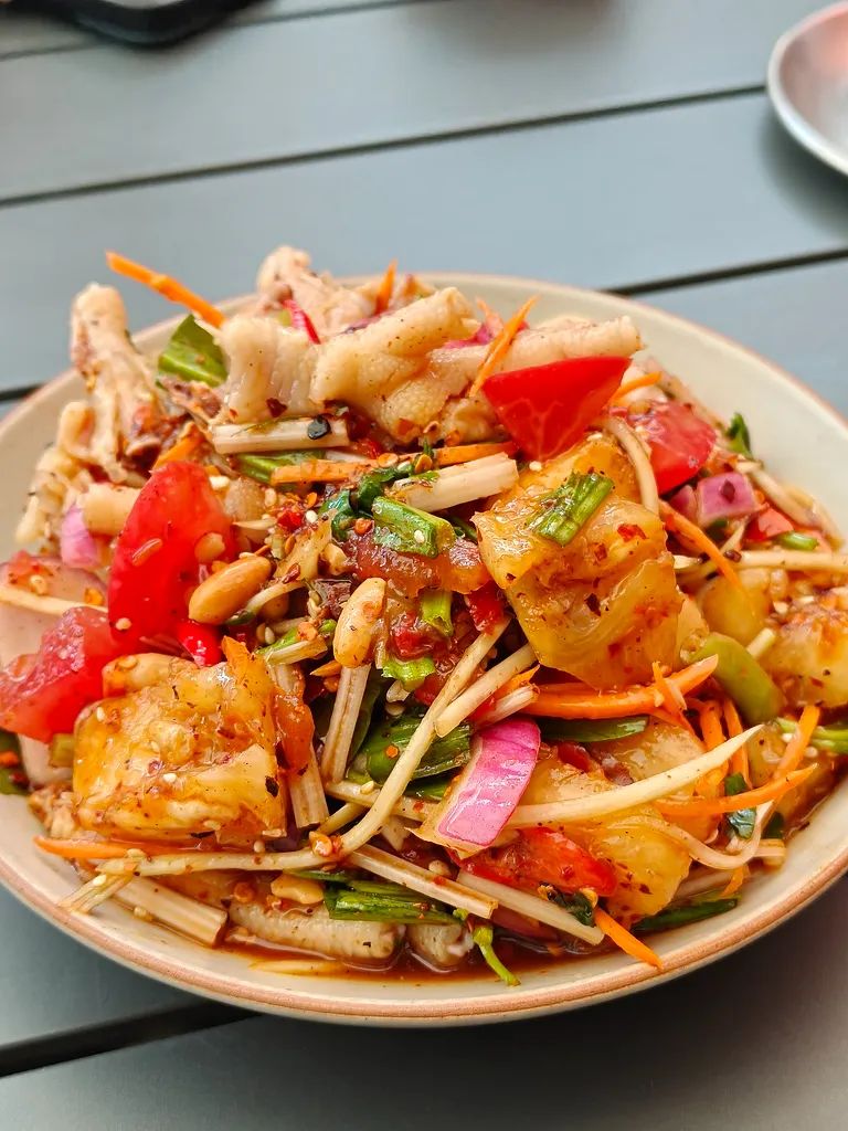 澜沧江边的告庄西双景星光夜市,就是西双版纳的味觉集散地之一。摊位一排排铺开,傣伞高挂,空气里混合着香茅、辣椒和炭火的味道。酸爽开胃的“舂”鸡脚最是热闹——柠檬、番茄、辣椒与香料被放进木桶中,用木杵捣到汁水四溢,再拌入软烂的鸡脚,酸辣鲜香直钻鼻尖。烤鱼则用香茅和柠檬叶包裹,外皮焦脆,肉质多汁;糯米饭蒸在椰壳里,带着淡淡椰香与米香交织的甜润。