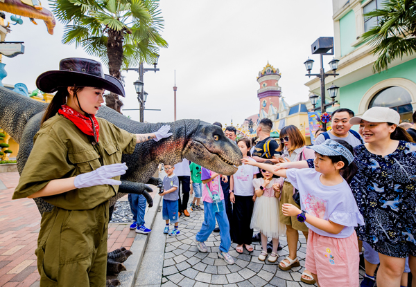 中华恐龙园内游客与“恐龙”互动。《中国旅游报》