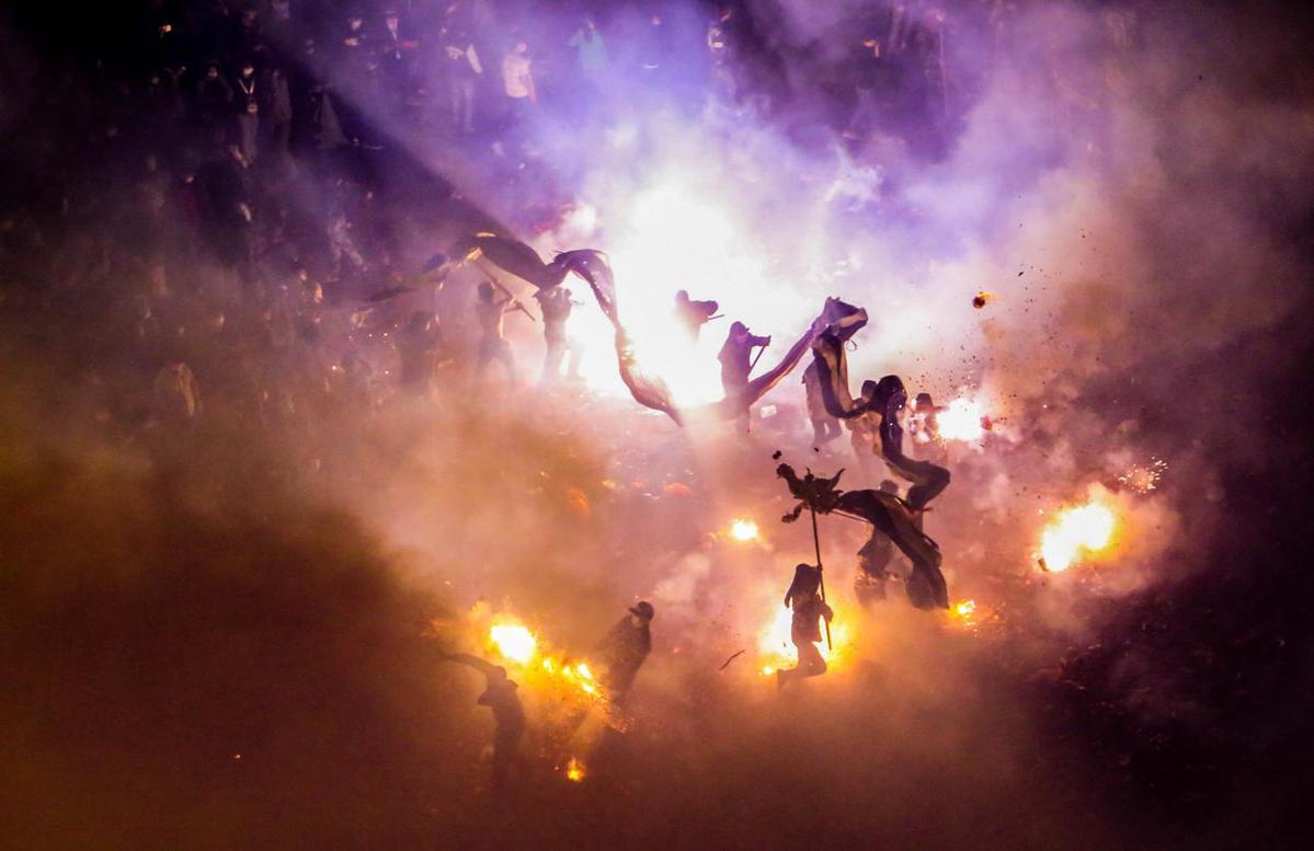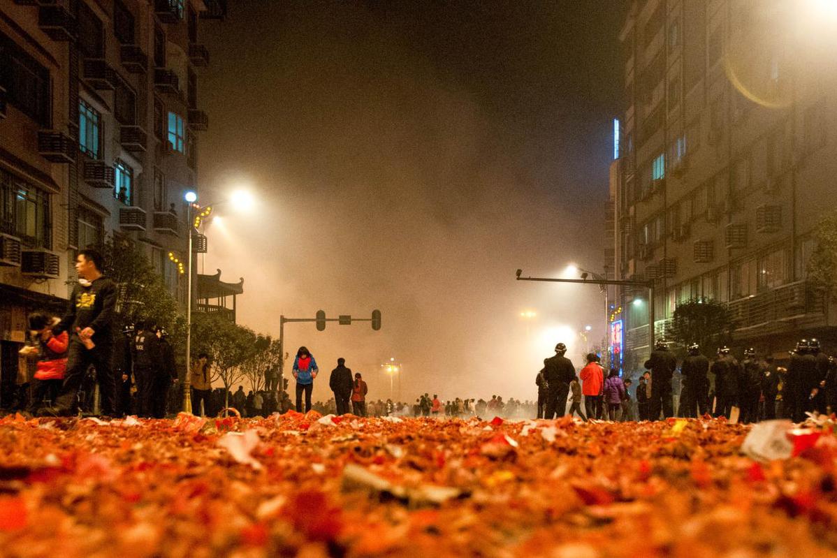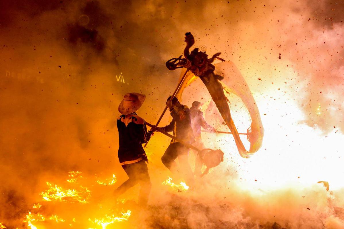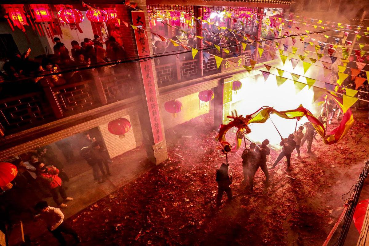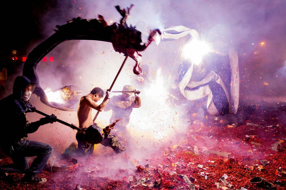 人们将一串串点燃的鞭炮抛向“游龙”