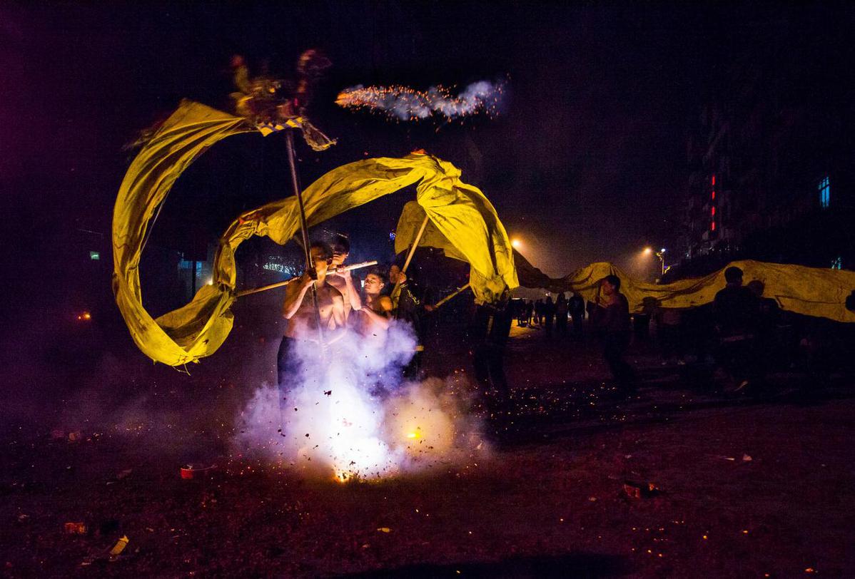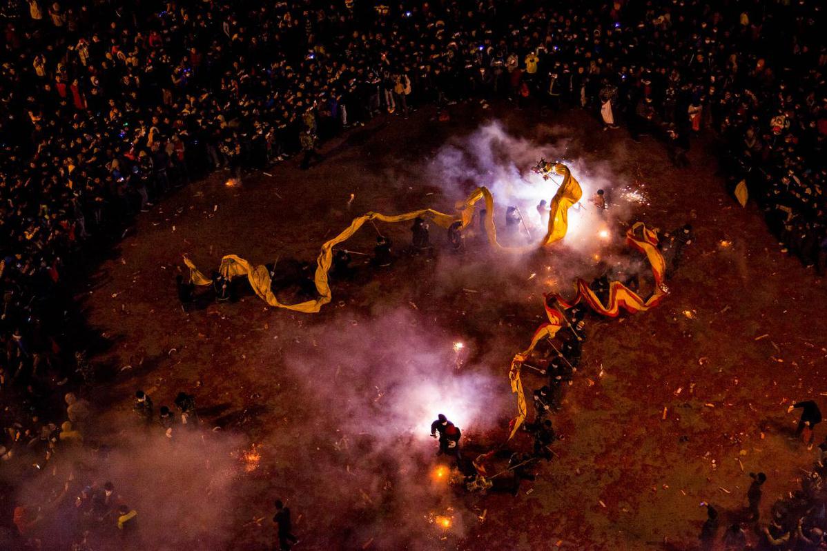 负责“调龙”年轻人们在鞭炮中舞动长龙