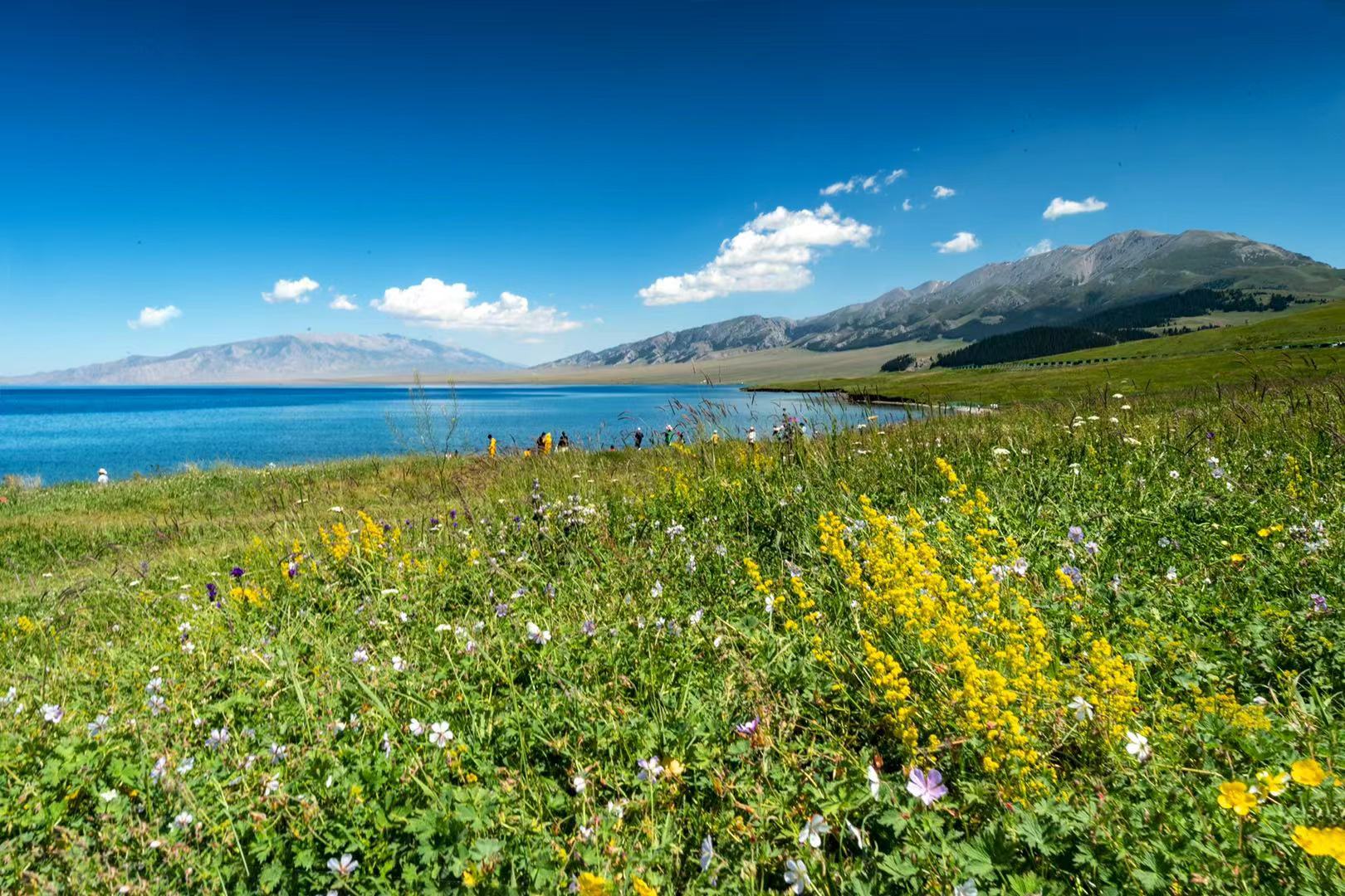 赛里木湖意为“山脊梁上的湖”,水域面积460平方公里,呈椭圆形,据说是新疆海拔最高、面积最大的高山湖泊,也是大西洋暖湿气流最后“眷顾”的地方,因此有“大西洋最后一滴眼泪”的说法。赛里木湖像一颗蓝宝石高悬于西天山之间的断陷盆地中,拥有金缎镶边、科山观松、净海七彩等十大景观。最佳游玩季节是每年的6月至7月,湖区草原上野花盛开,湖北以紫花为主、湖西主要是黄花、湖东主要是蓝色花朵,各有特色。