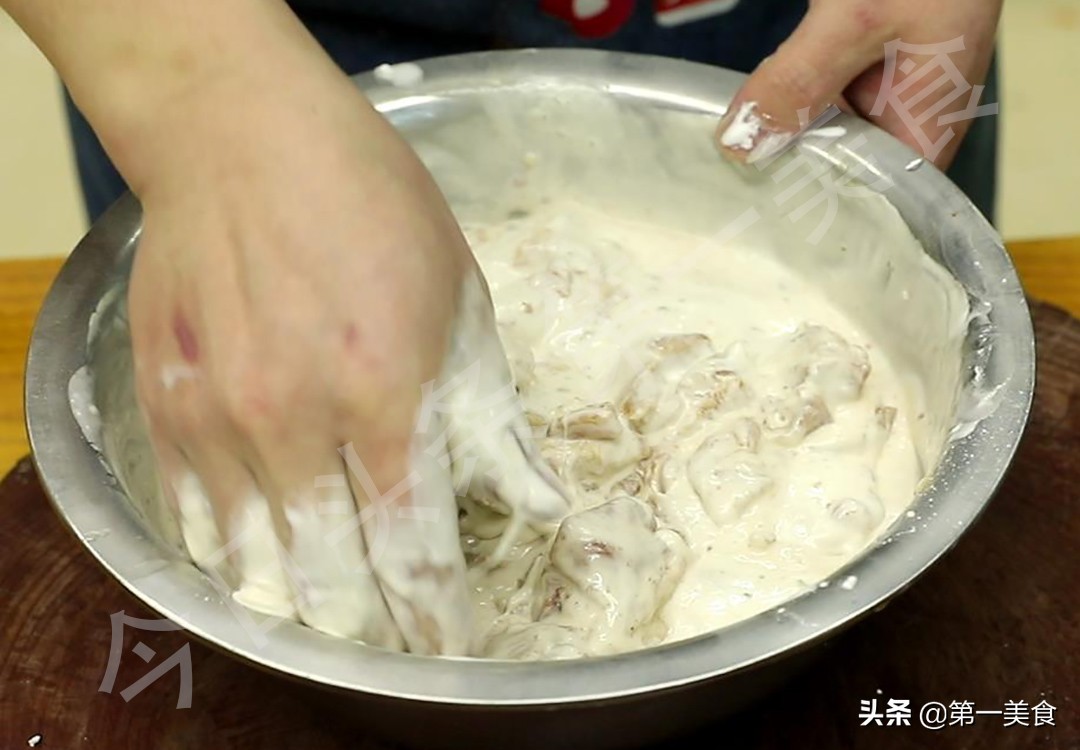 准备适量的红薯淀粉放入盆中,倒入一点泡打粉方便起酥,一边加入温水一边搅拌,调成稠一点的面糊,抓起来不会轻易的掉落即可,把腌好的鸡块放进去抓拌均匀,让每一个鸡块都均匀地裹上面糊。