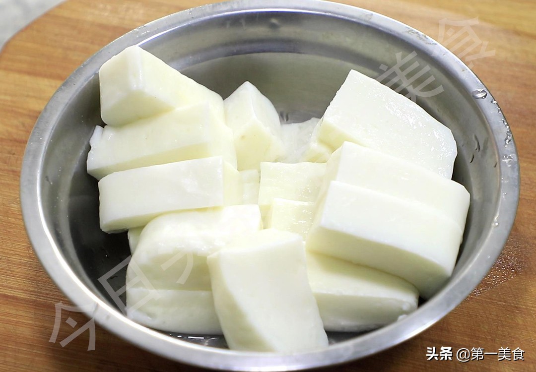 2个小时以后牛奶糊已经冻成牛奶块,切成2厘米厚的均匀小块备用。