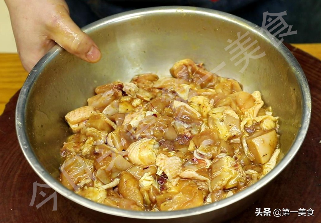 盆中加入适量的食盐、胡椒粉、鸡粉、料酒、蚝油、生抽、十三香、麻椒粉搅拌均匀,分次倒入葱姜水,用葱姜水去腥比直接用葱姜效果好,同时还能把水分打到鸡块里面,让肉质更加的饱满滑嫩,搅拌均匀后腌制2小时以上,给鸡块入味。