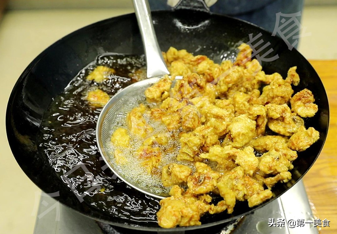 把油温升高至6成热时,倒入鸡块再复炸一遍, 一是吐油防止发腻,二是能使鸡块更加的金黄酥脆,复炸1分钟后即可捞出控油。