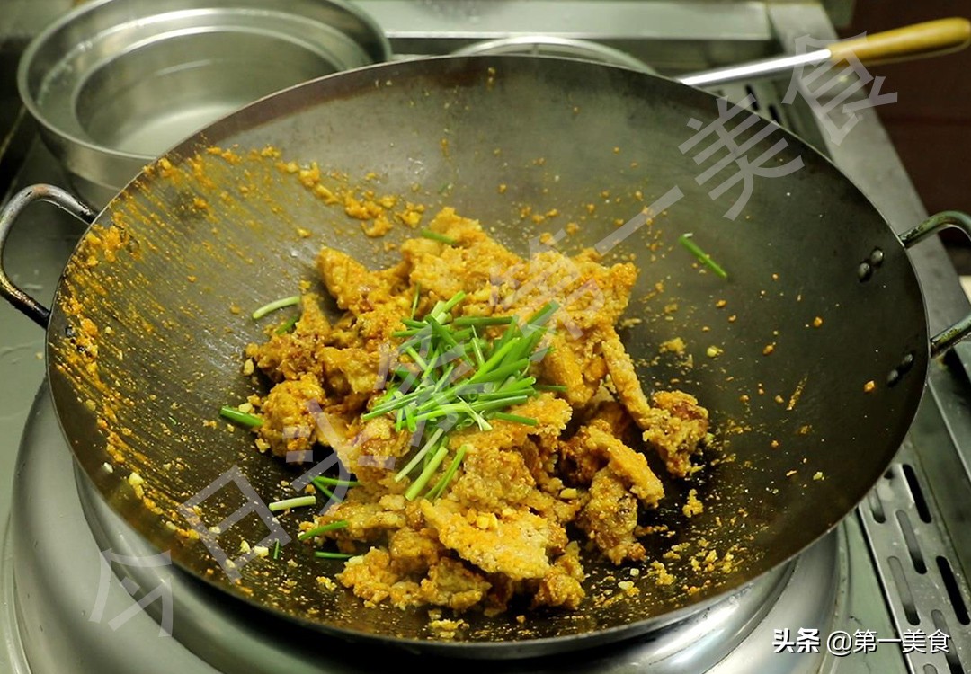 准备适量的蟹黄酱(生活超市卖的就有),锅内留底油,放入蒜片爆香,加入蟹黄酱炒散、炒化,把鸡块、锅巴倒进去,快速翻炒均匀裹上蟹黄酱,再撒入一点小葱提味,翻炒均匀后即可出锅,一道金黄酥脆的锅巴鸡就做好了。