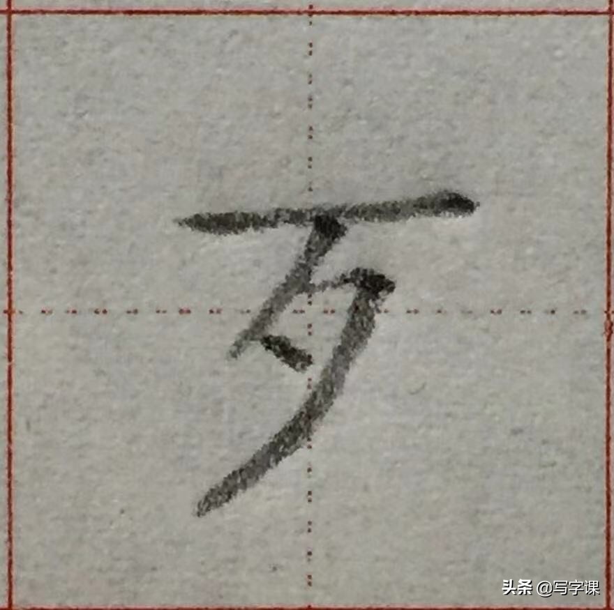 “歹”字最低点为撇尖处,这个字在书写时,上方横笔书写不宜扛肩过大,略长,长横像平衡杆一样把下面的部件悬挂住,下方书写时尽量摆正,第二笔撇起笔写在横笔的中间即可,横撇起笔处在撇的中间偏上一些。
