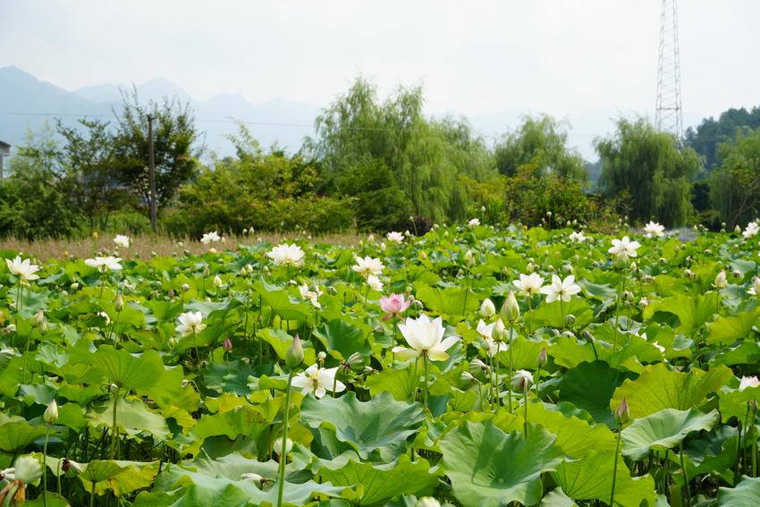 湖北日报客户端讯(通讯员李素)8月6日,在鹤峰县走马镇官仓村丁仁鹤的庭院中,连片的荷叶如绿色绸缎与周围的稻田连成片,粉嫩的荷花点缀其间,有的含苞待放似娇羞少女,有的怒放争辉若仙子凌波,清风拂过,荷叶翻滚起层层绿浪,荷香伴着蝉鸣沁人心脾。