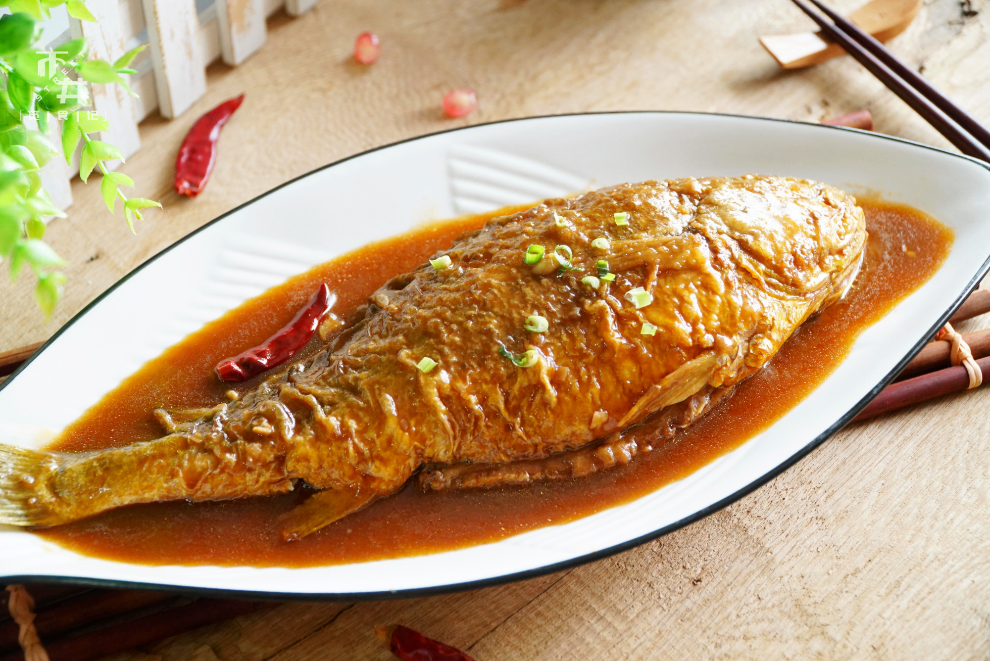 1、将黄花鱼剖开清洗干净后,加盐、黄酒、生抽、葱姜腌制10分钟入味,擦干表面水分,将鱼的两面均匀的拍上一层薄薄的玉米淀粉。2、锅中多放一些油,先煎鱼头,然后两面都煎到金黄备用。3、锅中留少量的油,放入葱姜蒜、干辣椒一小块猪油爆出香味,加入1碗水煮开。4、将鱼放入锅中,加入2勺番茄酱,1勺黄豆酱,2勺酱油,加适量的盐调味,大火煮开,中火煮10分钟入味。5、将所有的葱姜蒜等干料都捞出不用,加少量的水淀粉勾芡,大火收汁即可。