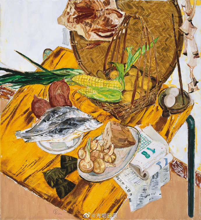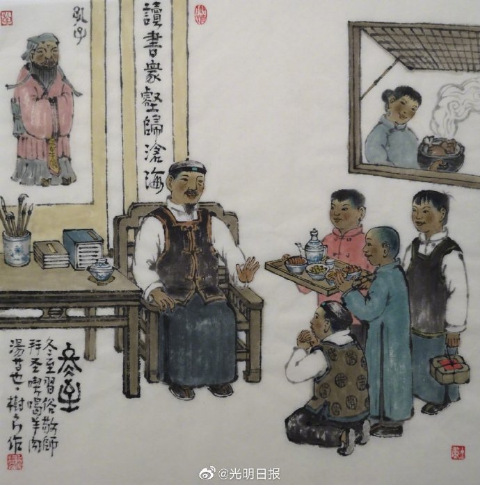 画说24节气【冬至你准备吃啥?】冬至曾是古人最隆重的节日之一。《清嘉录》中记载“冬至大如年”,足见其重要性。对老百姓而言,这天是个吉祥的日子,代表着旧去新来。 既然要“过年”,那就离不开一件重要的事情——吃。“冬至吃啥?”已经成为这一天人们讨论最热的话题。酸甜苦辣咸,诉说的都是美食背后浓浓的家乡味。对于无论什么节日都会吃饺子的北方人来说,冬至当然不能例外。毕竟俗语说了:“冬至不端饺子碗,冻掉耳朵没人管。”而在南方,人们更爱吃汤圆、年糕,有的地区还流行一种用糖、肉、菜、果、萝卜丝等做馅,糯米粉包制而成的“冬至团”,寓意一份团圆美满。正如戴士和在油画作品《开平冬至》里描绘的那样,鲜鱼、禽蛋、咸肉、粽子……这些让人垂涎欲滴的美食,为迎接冬至统统都要备出来。画家用笔生动自如,色彩饱满浓郁,每种食材都散发着生命力,给人强烈的现场感。透过眼前的画面,我们仿佛能看到主人家在厨房内外忙活的热闹场景。这或许正是每家每户在冬至这天对待“吃”这件事的真实写照吧。