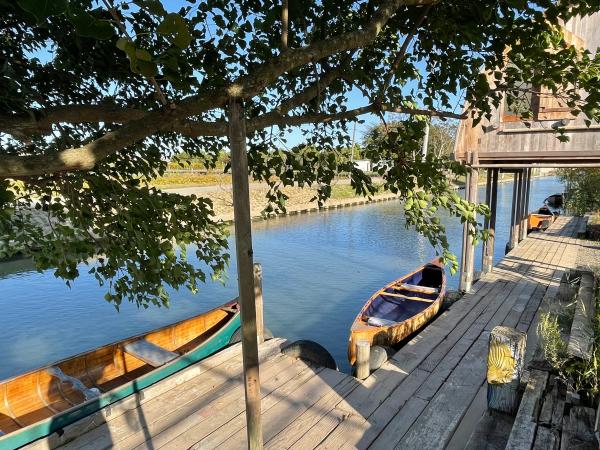 而在不远处农场的河道边,木质的船屋旁正拴着几条小船,既有正常大小的船,也有小型的儿童版独木舟。