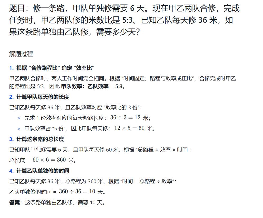 题目3:修一条路,甲队单独修需要6天。现在甲乙两队合修,完成任务时,甲乙两队修的米数比是5:3。已知乙队每天修36米,如果这条路单独由乙队修,需要多少天?