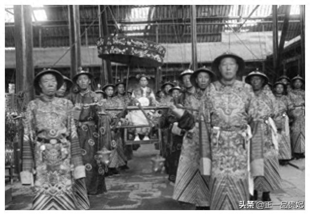 图中为慈禧太后出行时坐轿子的场景,由太监们抬轿,队伍的随行人员很多,排场很大。慈禧坐的是无篷轿,但后面有小太监撑着一顶“黄罗盖”。