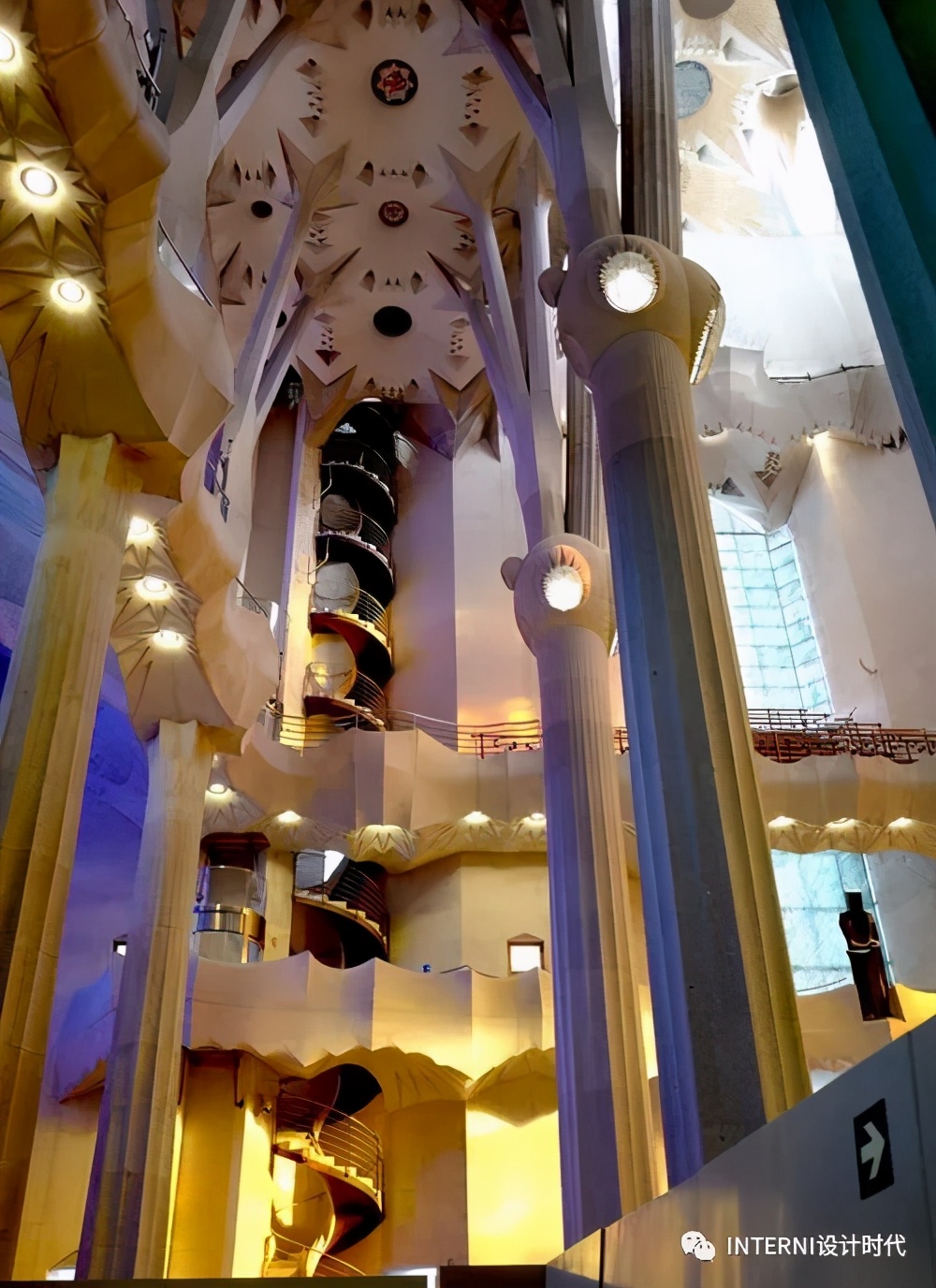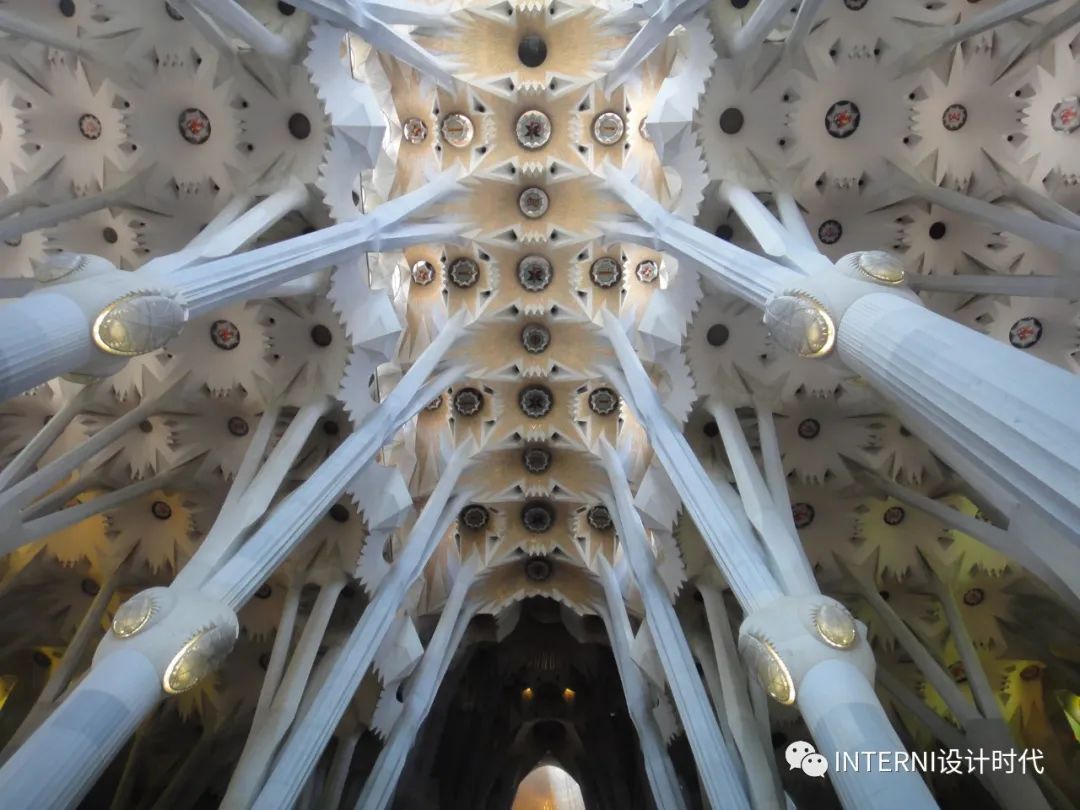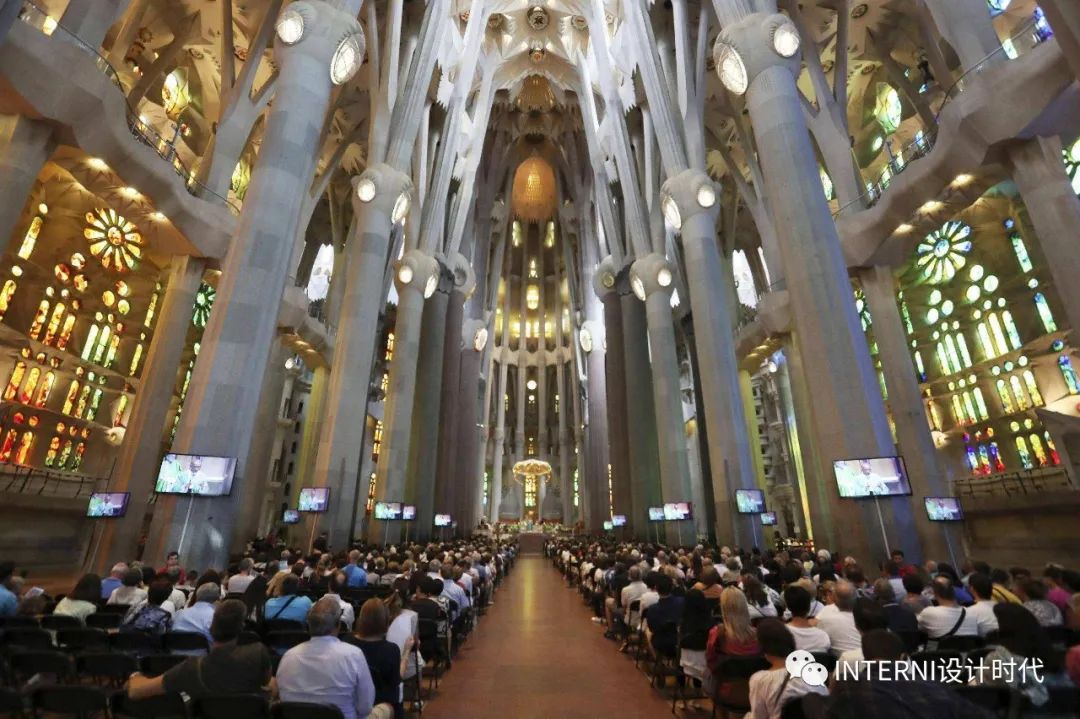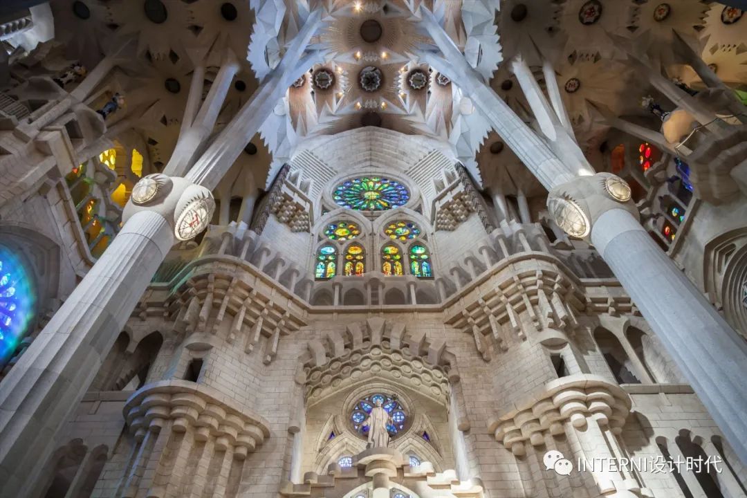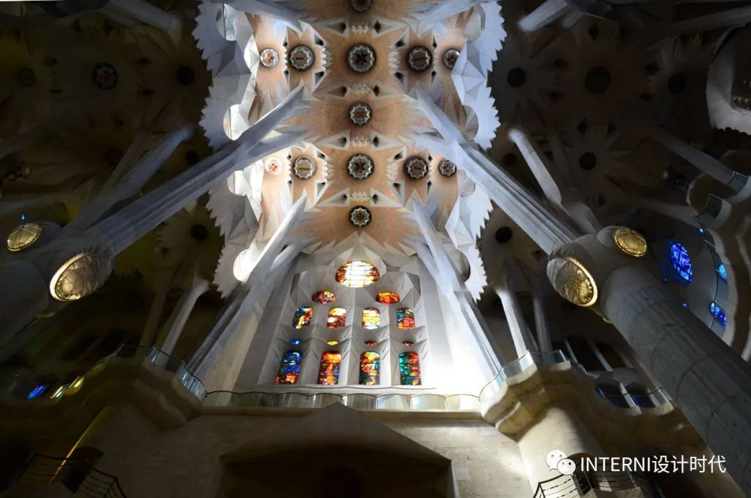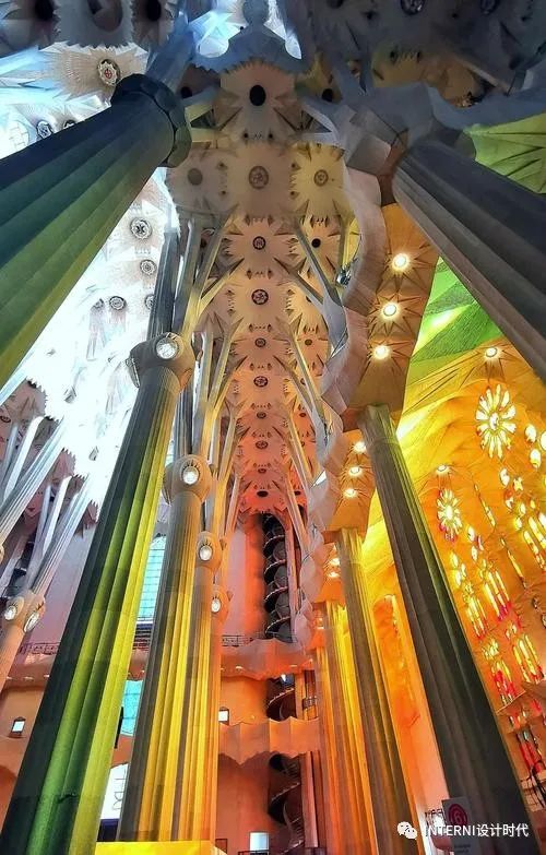 迷恋色彩的高迪选择在建造圣家堂时采用灰暗的石头,只有当一缕缕户外的光线透过彩色玻璃窗在教堂内划出一道道七色彩虹的时候,人们才会明白,高迪是将色彩交给了自然光。