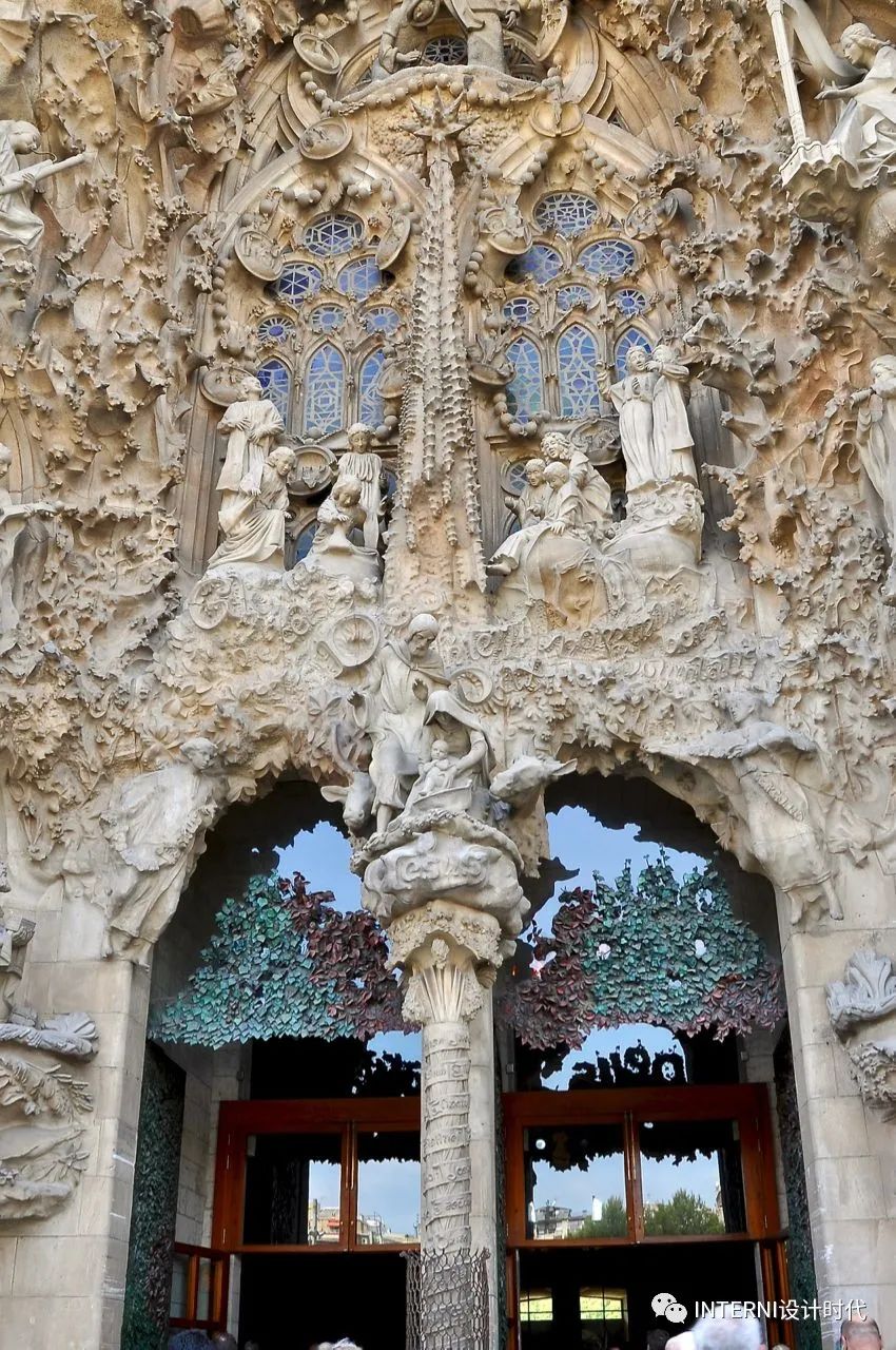 圣家族教堂外挂群组雕像的创作,区别传统意义上的欧洲各国教堂外部艺术创作。作为史诗一样的赞歌,在建筑外部就开始调动人们的情绪,提前铺垫和完成入口处心灵上的洗涤。教堂内部仿佛爬满自然生灵,植物、洞穴、绵延山脉与高迪醉心的自然相符。