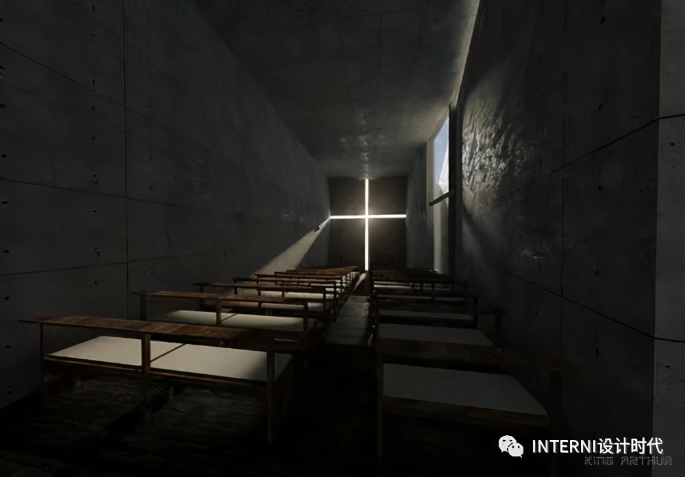 混凝土的浇筑和成形方式使其在自然光下发光。安藤在东立面放置的十字架让从清晨至白天的光渗透进来,将室内混凝土墙去材质化,从一个黑色体块变为一个发光的盒子。这与安藤除光之教堂以及其他多个项目中类似,他对光线与混凝土的掌控有一种超现实的效果,在感官上去除了材质,由暗至明,从而延展出空间。